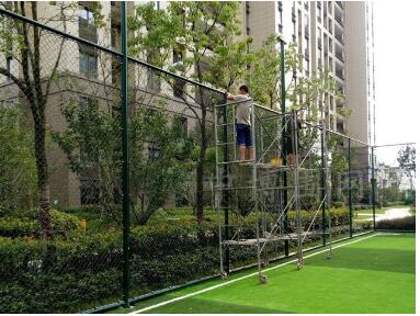 (4)、收緊圍網后把扁鐵穿上,用手電鉆壓緊螺絲先固定立柱、再固定橫桿。